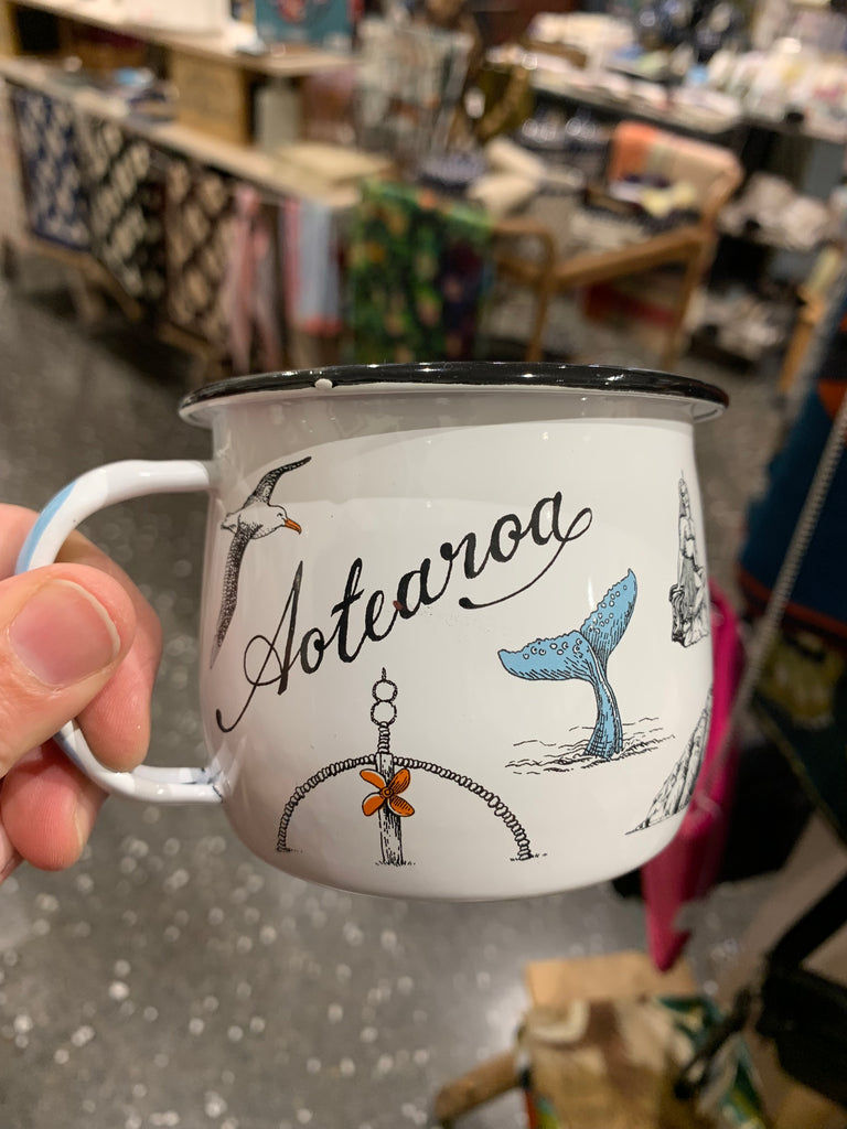 Enamel mug with Nz images print illustrated by Tanya Wolfkamp.