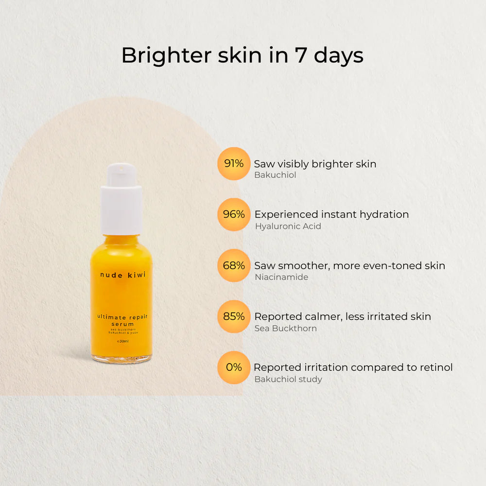 - 91% saw visibly brighter skin (Bakuchiol)